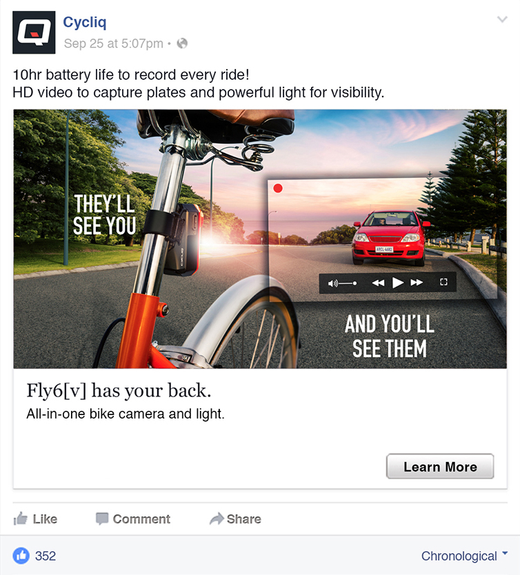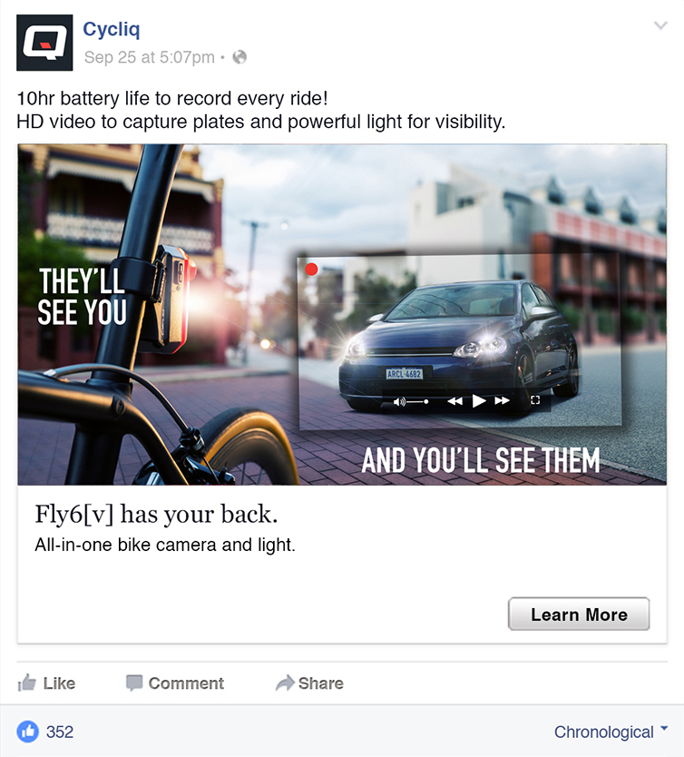 Early in 2017, Likeable Creative won a creative pitch against international agencies to launch the Cycliq range of safety camera bike lights to the world. The Perth-based, ASX-listed company was hoping to capitalise on the growing cycling revolution in many regions of the world with their unique 'dashcam' Fly12 and rear-mounted Fly6. Likeable Creative had been working on a project basis with Cycliq since December 2016, and was given the chance to pitch against Cycliq's international agencies for the global launch this year. The campaign included digital display advertising, cycling magazine ads, social media and online content.