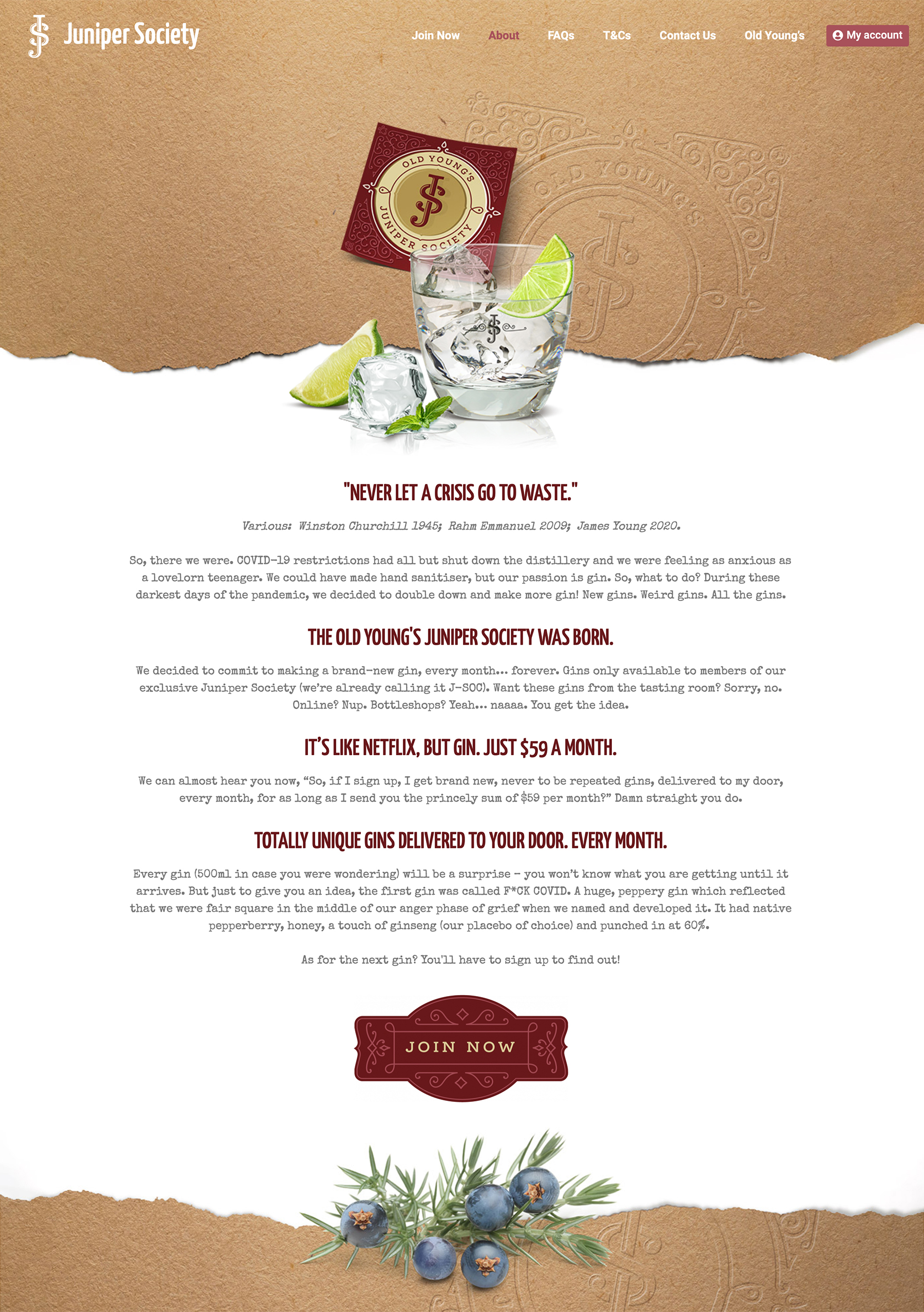 Old Young’s Distillery engaged us to create multiple brand concepts, logos and supporting elements that led to the development of a new monthly gin subscription brand, the Juniper Society. Likeable created all of the brand collateral, from the logo and brand story to packaging and print materials.
