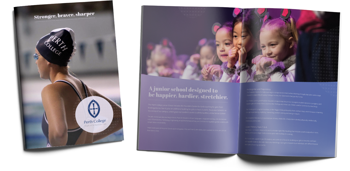 Likeable rebranded the private girls' school, Perth College, with a colourful new website, digital advertising campaigns, school prospectus and other publications. The foundations of the design are the purple colour, which reflects the Jacaranda trees that surround the school, and the curved shapes drawn from the sweeping lines of the logo.