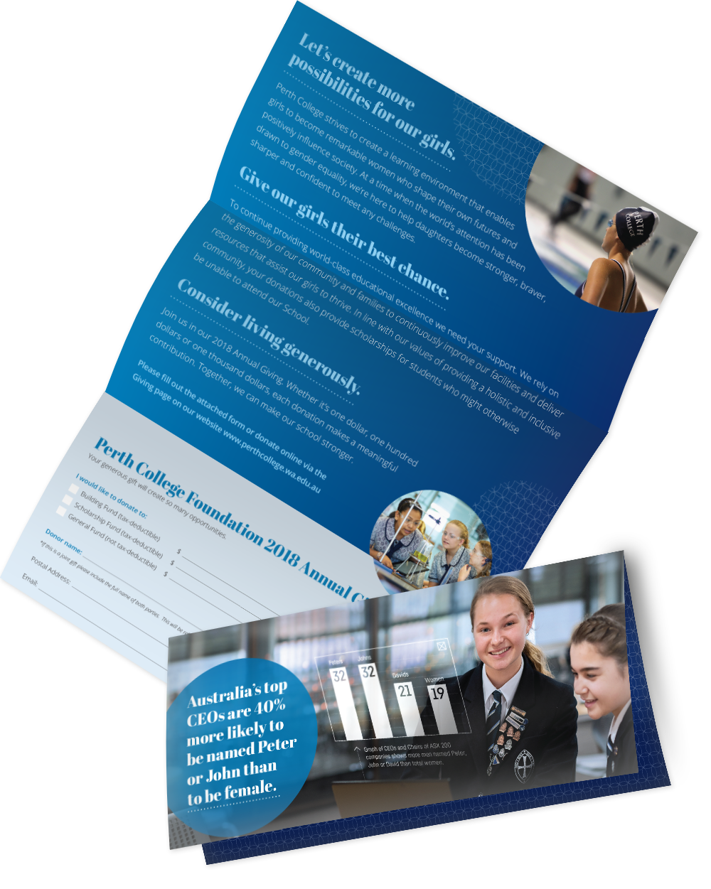 This direct mail piece highlights the challenges women face in the workforce (there are more CEOs named 'Peter' than there are women). We encouraged donations so the School could continue to give girls the confidence and skills to fulfil any dream.